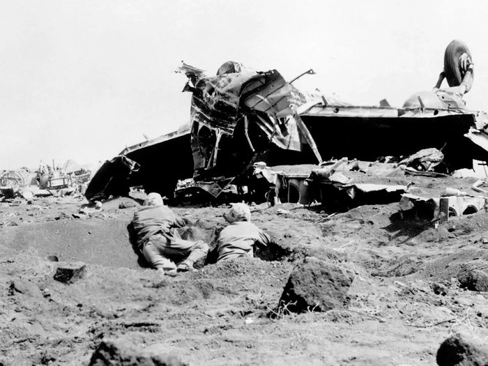 Destroyed Japanese planes in the ruins of Motoyama airfield no.1. It was another four days before the first American plane would land on the airfield under heavy fire. The Marines were not able to utilize their own spotter aircraft until the second week of the invasion.