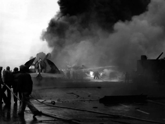 Above and below: Firefighting efforts by damage control parties on the flight deck of USS SARATOGA CV-3 in the evening of 21 February 1945.