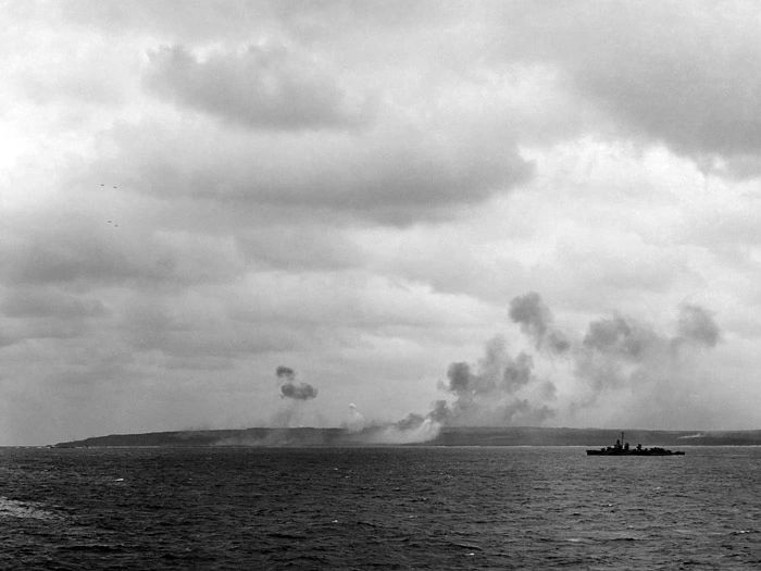 USS ASTORIA moves away from Iwo Jima. Following her 26-hour shore bombardment in which the ship fully depleted her ammunition supply, she rejoined the Fast Carrier Task Force.